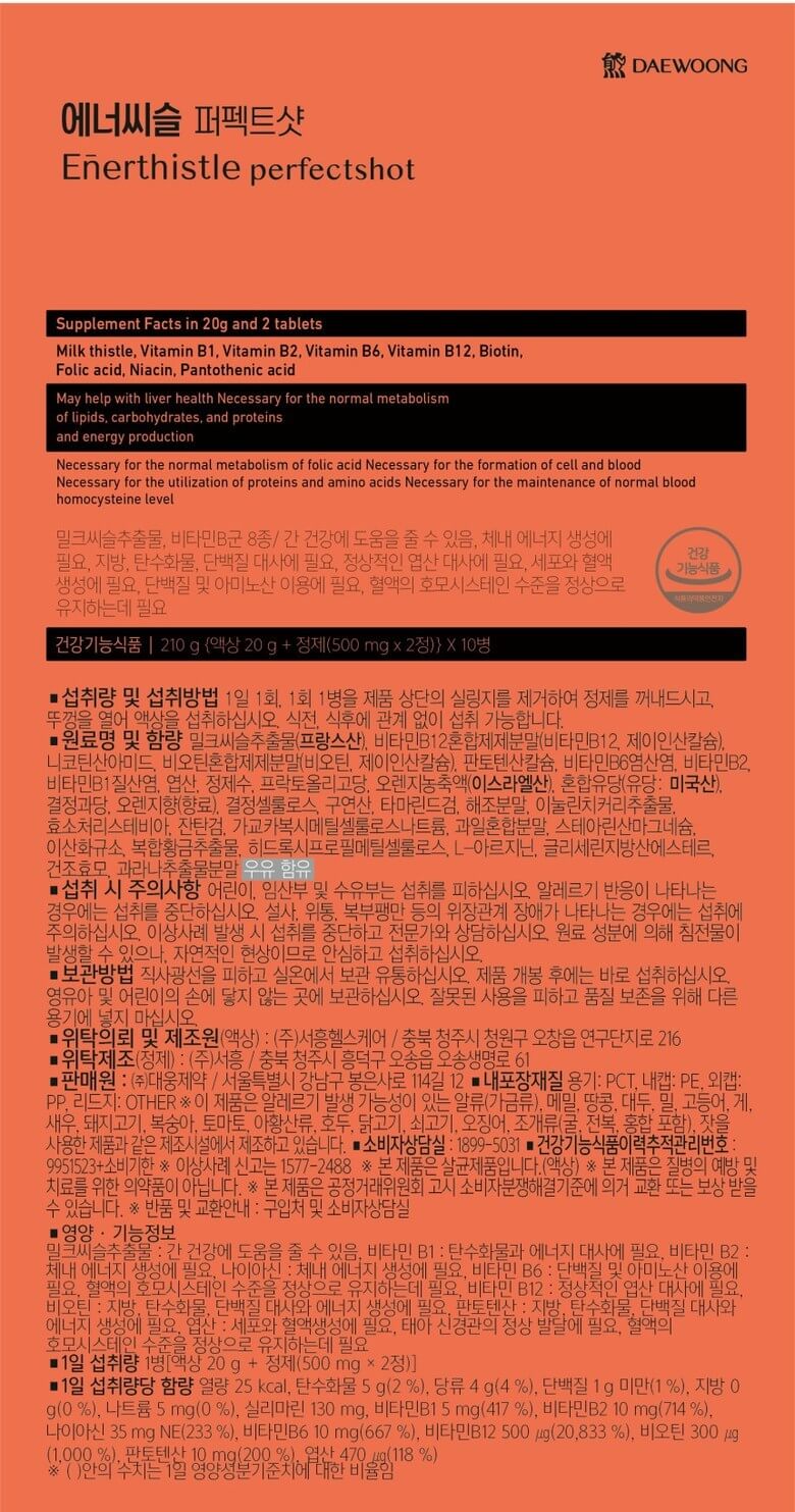 에너씨슬 퍼펙트샷은 밀크씨슬을 비롯한 성분들이 들어있어서 간 피로에도 도움을 줍니다. 여행하거나 운동한 후, 야근한 후에도 1일 1회만 복용하면 되고, 정제와 액상이 함께 설계된 제품으로 휴대하기도 편리합니다.
